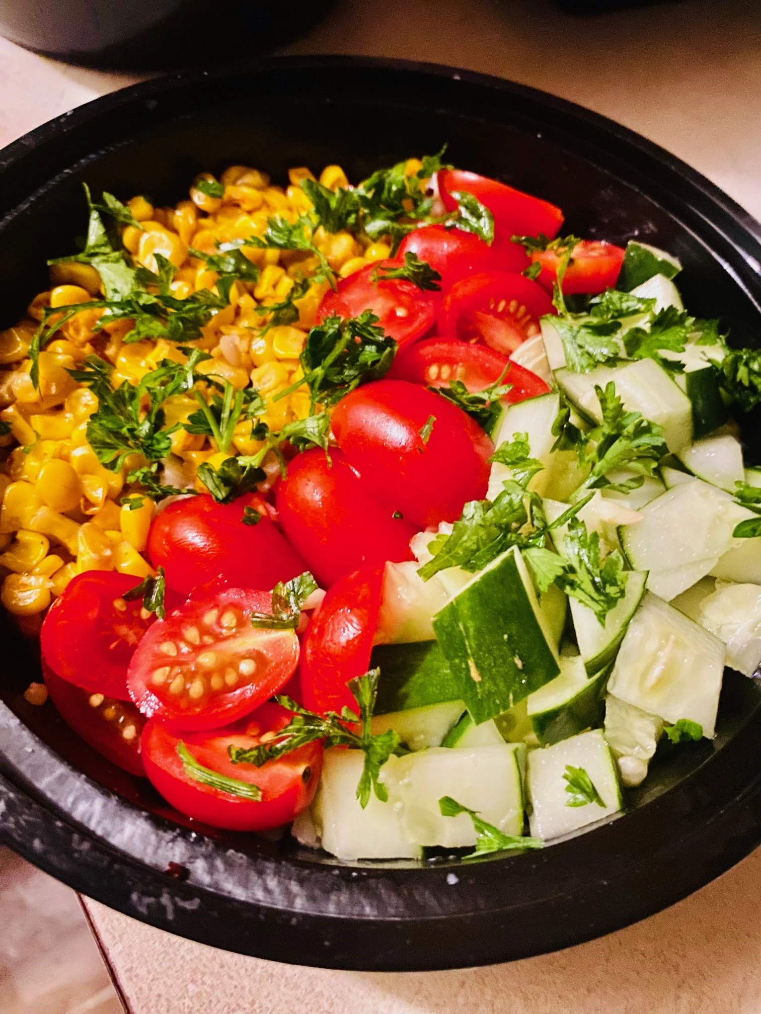 Add ¾ cup roasted corn, ½ cup cherry tomatoes, and ½ cup diced cucumber on top.